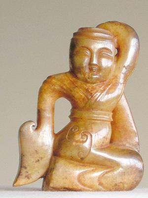 在此次古玉展中,展出了一套非常珍贵的玉雕“乐舞人”(下图为其中二件)。此套“乐舞人”共九件,高9cm。年代为西汉中期。玉质为和田白玉。由于玉质受沁,玉质颜色变为红褐色、黄色及青色。此套“乐舞人”以主人为中心,主人凭几跪坐,身后丞相执笏跽随,主人正前方二个妙龄美女长袖善舞,体态优美,左右前方分别有五个乐人伴奏,场面生动写实,当是主人身前写照。广州南越王墓出土有一件玉舞人,高3.5cm,为国家发掘出土汉代玉舞人首见的圆雕作品,被国家定为一级文物。此次展出的九件玉舞人器型大、琢制精细、器形优美,古器物的收藏追求成双成对、成组成套。单个立体圆雕玉舞人已很难得,何况此套玉舞人为九件一套。专家认为,此套“乐舞人”世所罕见,目前所知全世界仅此一套。