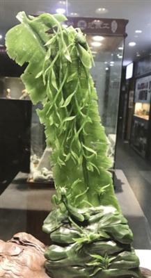 展览中有两件碧玉细雕作品,雕刻层次丰富,工艺水准很高。其中《静候佳音》是90后福建小伙王朝杰参评作品,画面主体为一张芭蕉叶,上有一蝉高歌,下面螳螂舞爪跃跃欲试,作品镂雕处理得繁而不乱,尤其是攀于芭蕉叶上的一串草叶玲珑剔透,翻卷自然,面面可观,体现了很高的工艺技术。如今在雕刻界,走工细一路的雕刻师不断挑战技艺难度,写实能力普遍达到了很高水准。