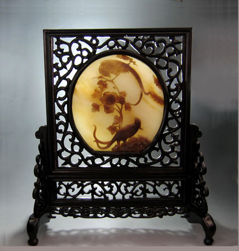 牡丹花正灿然绽放,层层叠叠,舒展俊雅,富贵而华丽,一对绶带鸟,体态轻盈优美,头顶美丽的羽冠,一只立于山石上,正回首翘望,另一只立于牡丹花枝头,正俯身凝望,似乎在传达着彼此的眷恋,爱意绵绵。此刻,盛开的牡丹和一对绶带鸟构成了一幅自然和谐的画面,动静相宜,相映成趣。 此件插屏以白玉和糖玉共生的玉料琢之,白玉缜密细腻,脂厚温润,糖玉则色浓均匀,鲜艳瑰丽。“绶”谐音同“寿”,含长寿祝福之意,绶带在古时还常用来表示官吏的等级,因此绶带鸟不仅有长寿的寓意,还包含了富贵荣华之意。是不错的摆件。 产品图一: 产品图二: 产品图三: