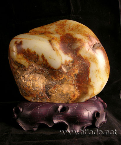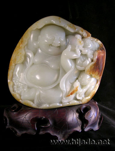 籽料摆件,以大块籽料碾琢,材料玉质细腻,红皮浓艳,肉质呈青白色,局部有微花,背面的底部有石性,也披有氧化色,工艺师巧用籽料的皮色及背面石浆的形状,想象成秋天将枯的大荷叶,一个胖弥勒,笑逐颜开,半趺坐于其中,一对金童玉女紧偎弥勒身旁,手执如意和蝙蝠,其间饰有莲蓬和莲子,其浓浓的吉祥含义自不待言了.工艺上,人物传神,衣摺舒朗流畅,背面未做修饰,体现了大自然的造化,给赏石者留下想象的空间.