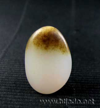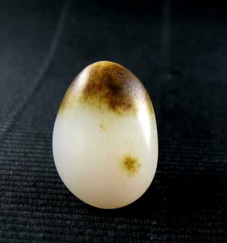 和田玉小籽料原石。形儿非常完整,褐色皮聚而不散,白净的面上又来一点皮儿,如美人痣,充满了灵性。
