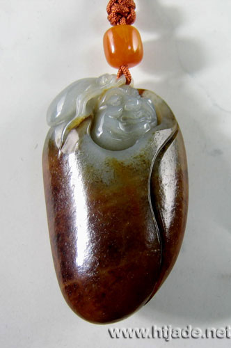 和田玉籽料白玉把件布袋佛。以新疆和田玉籽料为材。此原料是润泽的青白玉与红皮的岩石的结合体,在历经大自然的冲击下,形成浑然一体的奇妙景象。工匠巧开窗,以玉部分琢布袋佛笑态盈盈,一眼开,一眼闭,眼神充满诡秘,似乎准备揭晓肩上宝袋里的谜底。留下红皮的石部分,是笑佛的红袍袈裟,很有意思。