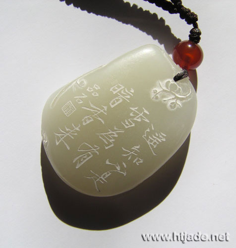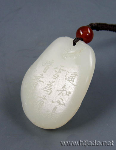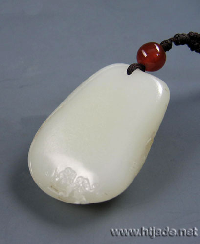 原籽除了侧面有小绺之外,完整性非常好,两面扁平,缜密细腻,白度中上,温润而泽,设计者因料施意,以王安石的《梅花》,“墙角数枝梅。凌寒独自开,遥知不是雪,为有暗想来”构图,正面大量的留白,以美玉天然的色泽和温润感,表现淡云、晓日、凌霜、微雪的冬境,只在侧面有瑕的部分,勾勒一树梅,其枝虬曲苍劲,疏梅沿着枝干以含苞、盛开、待放的姿态,依次安排于玉料的侧面,正面和背面,恰到好处,构思精巧,玉料的瑕被一树虬曲的梅巧妙的借掉了,可见设计者深厚的艺术底蕴了,背面,阴刻王体“遥知不是雪,为有暗香来”,点明主题。并留“品石”印章,书法挥毫酣畅,才情毕现,为此玉件带来更精彩的一笔。也为当今玉界的书法表现带来一丝曙光。玉件融诗、书、画、篆为一体,是玉中书画是也。