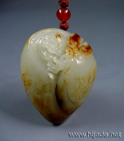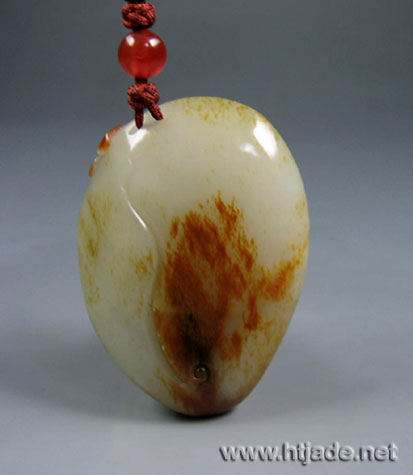 和田玉籽料白玉把件笑佛。以新疆和田玉籽料为材。材料细腻温润,白度中等,色稍闪灰,通体洒枣红皮,色由浅至深过渡自然,侧面皮色处有丁点微花,无碍。随形雕一笑佛眉开眼笑,手执如意,头顶红皮俏色,寓意“鸿运当头”,工艺上最大限度的保留了籽料的原形,背面平整,手感质感佳,适合把玩。