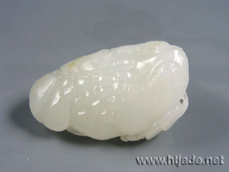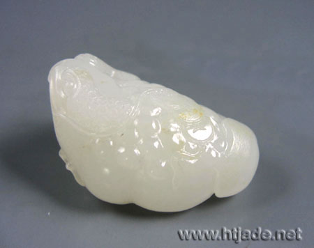 相传三足蟾为刘海携物,每以杖击之,则吐铜钱,故三足金蟾是钱财的象征。此玉件以新疆和田玉籽料琢刻,材质上等,玉质缜密细腻,洁白如雪,脂感浓厚,飘洒金皮,圆雕金蟾昂首前视,口衔绳索贯穿钱币,蕴涵挟财富来献之,玉件挂于颈前或挂腰随身,都非常好。