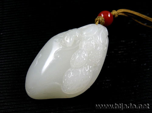 和田玉籽料白玉把件生意兴旺。以新疆和田玉籽料为材。料子属上等白光籽儿,少色皮,白度佳,缜密细腻,纯净无杂,籽儿大致呈菱形,右侧浮雕两颗花生上下叠靠,并蒂同根,左侧一子鼠凝视之,丰收在即,美食佳肴近在咫尺,指日可待了。构图有情趣,寓意也很吉祥,花生又谓长生果,意为健康长寿,鼠谐音"数",多也,花生子鼠喻为生意兴隆,财源兴旺,背面光素,美玉凝脂味道尽显。