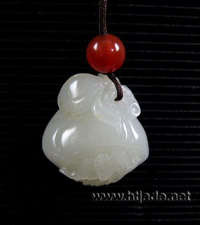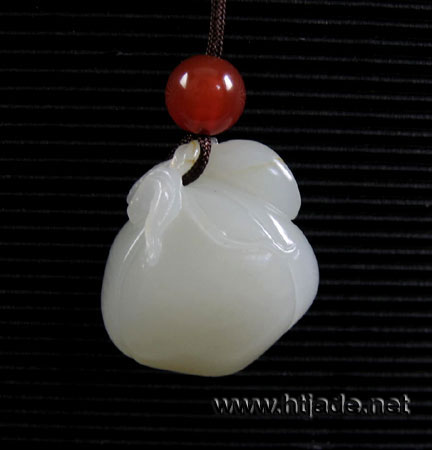 和田玉籽料白玉挂件纳福。以新疆和田玉籽料为材。材质缜密细腻,润度很好,玉性纯粹,白度一般,闪黄,两只一大一小的莲蓬紧紧依靠,蝙蝠落在莲子上,携铜钱一串,构图喻为“连连有福”,“吉祥纳福”矣。 产品图一: 产品图二: