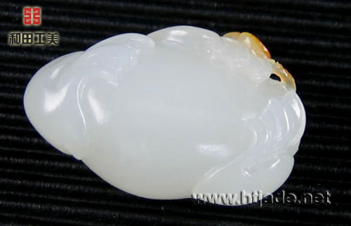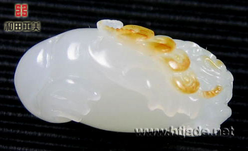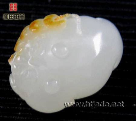 和田玉籽料白玉挂件金蟾。以新疆和田玉籽料为材。材质等级非常高,白净细腻,金皮巧雕成一串铜钱,一只丰满的三足蟾口衔之,工艺好,三足蟾是刘海的携物,是财富的象征。 产品图一: 产品图二: 产品图三: