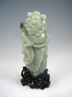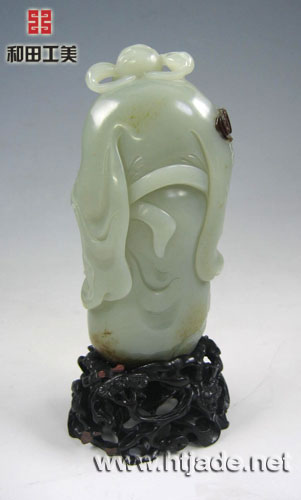 钟馗为传说中的神明,善捉鬼,是驱邪纳福的象征,此摆件以新疆和田青白玉籽料琢之,玉质缜密细腻,纯净,脂性好,琢钟馗身形伟岸,高大壮硕,着官服,戴官帽,满面纠髯,横眉狰目,手捏剑诀,抬腿怒喝,极具慑人气魄,身后右肩以褐色皮巧雕一蝙蝠,显示赤霄铭剑,已灭妖魔,鸿福自天上来矣。此件人物琢刻传神写实,有气势,功力精湛,虽以青白玉籽料为材,仍具很强的艺术性,而且由此价格优势也凸显。