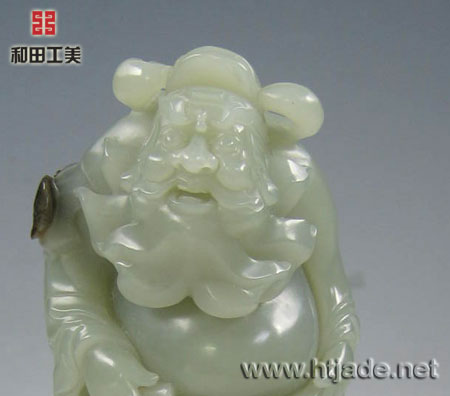 钟馗为传说中的神明,善捉鬼,是驱邪纳福的象征,此摆件以新疆和田青白玉籽料琢之,玉质缜密细腻,纯净,脂性好,琢钟馗身形伟岸,高大壮硕,着官服,戴官帽,满面纠髯,横眉狰目,手捏剑诀,抬腿怒喝,极具慑人气魄,身后右肩以褐色皮巧雕一蝙蝠,显示赤霄铭剑,已灭妖魔,鸿福自天上来矣。此件人物琢刻传神写实,有气势,功力精湛,虽以青白玉籽料为材,仍具很强的艺术性,而且由此价格优势也凸显。 产品图一: