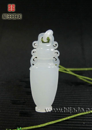 挂件取材新疆95年的于田料,细腻纯净,洁白如雪,温润如脂,等级极高,小素瓶挺拔隽秀,镂雕文饰精美,上挂活环,充满了灵动之美,女士佩带典雅大方。 产品图一: