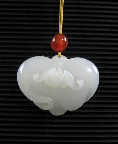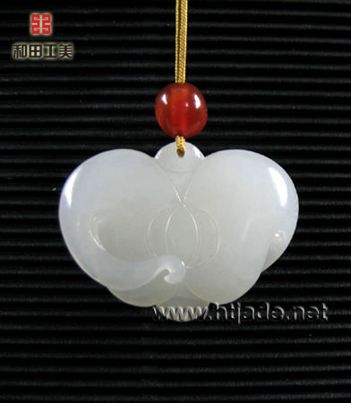 和田玉籽料白玉挂件纳福。以新疆和田玉籽料为材,材质缜密细腻,纯净无杂,晶莹润泽,白度好.圆雕一只大蝙蝠敛翅呈桃心型,小蝙蝠攀附其上,寓为福上加福,挂件两面扁平有型,材质等级高,佩带很漂亮. 产品图一: 产品图二: