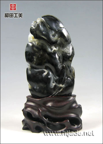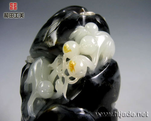 新疆和田玉青花籽料,黑白巧雕摆件。以新疆和田玉籽料琢之,材质缜密坚实,润度极好,料子黑白较为分明,工艺师巧妙布局,占料子大面积的墨玉部分,设计为悬崖峭壁,陡峭山石,其间的白玉部分,则琢为清澈的水流,水势或细流高悬或急流飞溅,场景的视角很宽,最经典的部分莫过于白玉部分的两只顽猴了,两猴攀于山崖边,一只猴扯下结了果实的桃枝往上递,上面的猴子蹲卧着身子往上提,猴子的肢体形态表现的淋漓尽致,充满了动势,讨巧的是,两只桃子镂雕后,浑圆饱满,洒着金皮,令人垂涎欲滴,是天宫的王母娘娘在开蟠桃会?还是身置花果山?令人遐想,仙宫捧果献寿,必是福如江水不竭,寿比南山更高了。