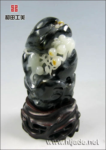 新疆和田玉青花籽料,黑白巧雕摆件。以新疆和田玉籽料琢之,材质缜密坚实,润度极好,料子黑白较为分明,工艺师巧妙布局,占料子大面积的墨玉部分,设计为悬崖峭壁,陡峭山石,其间的白玉部分,则琢为清澈的水流,水势或细流高悬或急流飞溅,场景的视角很宽,最经典的部分莫过于白玉部分的两只顽猴了,两猴攀于山崖边,一只猴扯下结了果实的桃枝往上递,上面的猴子蹲卧着身子往上提,猴子的肢体形态表现的淋漓尽致,充满了动势,讨巧的是,两只桃子镂雕后,浑圆饱满,洒着金皮,令人垂涎欲滴,是天宫的王母娘娘在开蟠桃会?还是身置花果山?令人遐想,仙宫捧果献寿,必是福如江水不竭,寿比南山更高了。 产品图一: 产品图二: 产品图三: