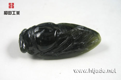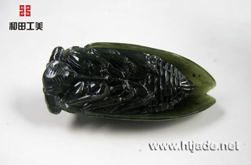 和田玉各色系中,墨所占的比例很小,通常整块玉料中,墨的程度强弱不均,通常在白、青玉中过渡,此墨玉蝉,墨色纯净均匀,温润而泽,工艺师以实物实写刀法,细琢眼、吻、足、腹,脉理分明,线条畅达不滞,双翼轻薄透光,抛光也有极佳的表现,整体造型栩栩如生,是小件的精品。