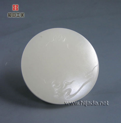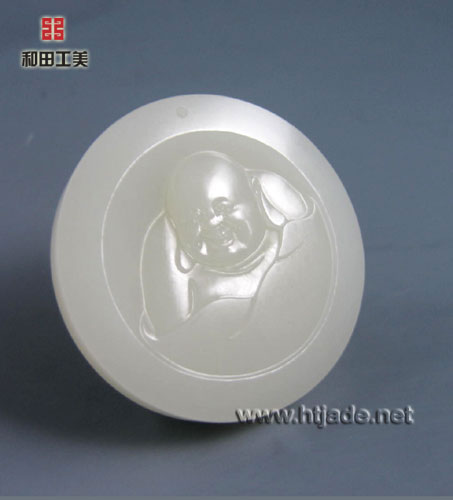 和田玉籽料圆牌。材质缜密,凝脂味浓厚,白中偏黄,非常悦目,牌成圆型,斜刀开窗亦呈圆,窗里琢笑佛圆额秃顶,大耳垂肩,笑容满面,巧妙安排荷叶作半包状,烘托笑佛的主题,笑口常开,大肚能容,时时启发佩者的心智矣。作品构图新颖,繁简有致,另人耳目一新。 产品图一: 产品图二:
