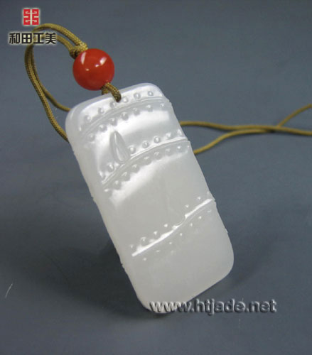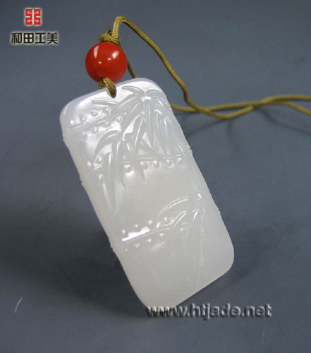 和田玉籽料竹牌。以上等新疆和田玉籽料琢之。材质缜密细腻,洁白如雪,温润如脂,堪称上等籽料,玉牌无边框,无额首,中浮雕竹节数段,竹叶劲韧锋利,节点也历历在目,玉牌构图疏密有致,格调高雅,佩者定是胸有成竹,虚心纳雅之士矣。 产品图一: 产品图二: