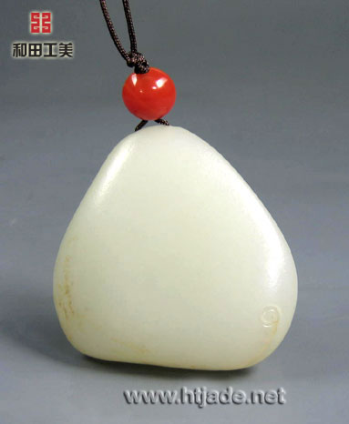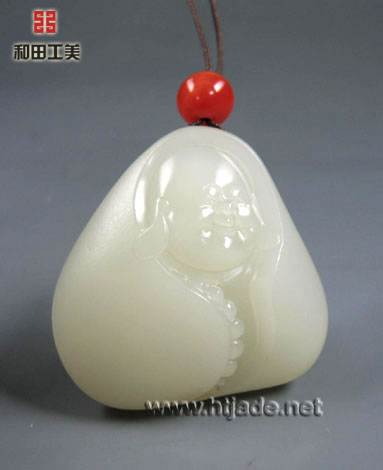 和田玉籽料白玉挂件笑佛。以新疆和田玉籽料为材,材质缜密细腻,纯净无杂,白度好,原籽呈三角,工艺师开窗细雕笑佛脸部,圆额秃顶,笑眼大耳,笑容极具感染力,其下一笔斜刀,衣袍便隐于料形中,胖胖的身躯已由天然的料形予以表达,非常巧妙,衣袍中露出佛珠粒粒在目,颇具禅机,玉件工艺精湛,繁简从容,玉料上乘,叫人爱不释手,养眼。 产品图一: 产品图二: