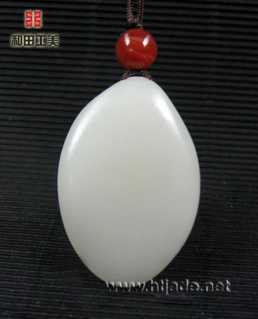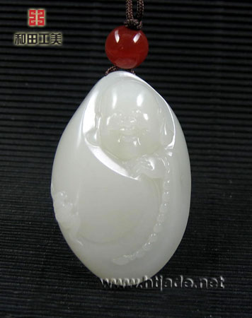 和田玉籽料白玉挂件笑佛。以新疆和田玉籽料为材,材质缜密度极好,纯净润泽,白度好,原料完整形如椭圆,十分难得,工艺师随籽的形儿布局,细雕笑佛开心而笑,状极欢乐,佛珠长串绕于手中,一副万事无忧的样子,羡煞凡间俗人,旁有蝙蝠临身,更是增添几分喜气,挂件工艺凝练,佩带有型,浓厚的凝脂玉感,夺人眼目。是玉中精品。