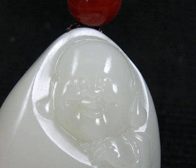 和田玉籽料白玉挂件笑佛。以新疆和田玉籽料为材,材质缜密度极好,纯净润泽,白度好,原料完整形如椭圆,十分难得,工艺师随籽的形儿布局,细雕笑佛开心而笑,状极欢乐,佛珠长串绕于手中,一副万事无忧的样子,羡煞凡间俗人,旁有蝙蝠临身,更是增添几分喜气,挂件工艺凝练,佩带有型,浓厚的凝脂玉感,夺人眼目。是玉中精品。 产品图一: 产品图二: 产品图三: