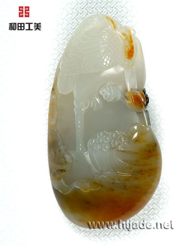 一只鹭鸶在河塘捕食,金色的羽冠,璀璨夺目,花,藕,叶浮在水面,满池花香,生机盎然,飘渺若云的皮色,显得分外雅致,背面酷似海边的岩石,饱含岁月,一幅漠漠的田野风光,令人赏心悦目而忘倦矣。此件为和田玉籽料手把件。以新疆和田玉籽料为材。玉质细腻白净,皮色夺目,通过遮脏去绺,在有限的空间,展现画有尽而意无限的至高艺术境界,是佳作。