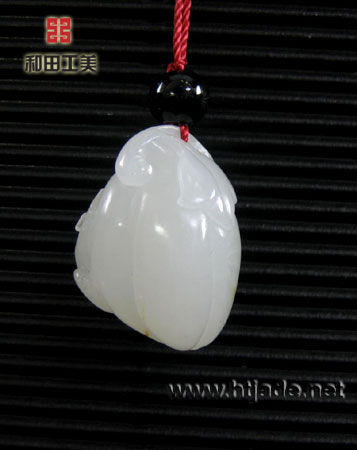 因瓜多籽,故瓜多比喻为多子多福,多好运也,此挂件以新疆和田玉籽料琢之,玉质细腻缜密,温厚脂感强烈,白度佳,随籽的形儿琢刻,以带弧度的阴线即琢成瓜的六瓣,上端碾琢蒂头连着两片瓜叶,叶子柔嫩富弹性,瓜体攀附着一只松鼠,松鼠即"送福",不仅使吉祥寓意更浓,也为静态的瓜果带来生命活力。挂件色泽迷人,尽显典雅气质,是女士的首选。 产品图一: 产品图二: