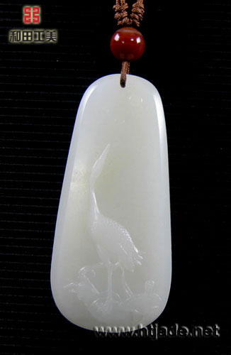 和田玉白玉山料方牌。材质细腻缜密,白度达羊脂,触之如雪若云,手感很好,牌呈水滴型,浮雕一只仙鹤引颈扬首,拳腿而立,神态优雅,气度非凡,牌子的空间布局设计合理,留白显得很肃静,鹤为禽类的宗长,素有"一品鸟"之称,也是长寿的象征。鹤寿延年,一品当朝,寓意很吉祥。是不错的挂件,正面上部有一条水线约1公分,略有微花,无碍。 产品图一: 产品图二: