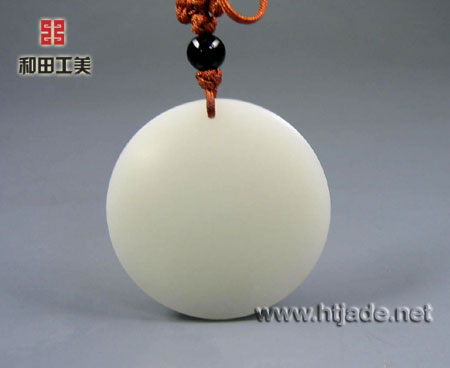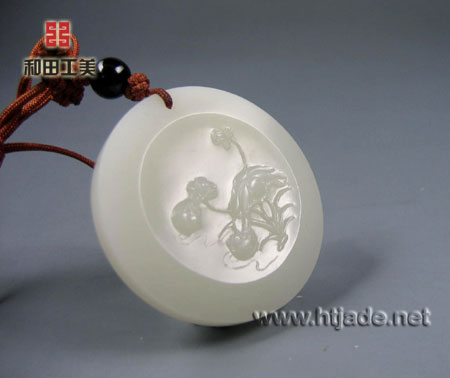 和田玉籽料白玉挂件荷花鸳鸯图。以新疆和田玉籽料为材,材质细腻温润,白度中等,牌成圆形,正面开窗亦成圆,内浮雕荷花、莲蓬,荷叶舒展,边缘翻卷,一对鸳鸯在花叶的庇荫下,自在划水,背面光素无纹,散发着和田玉温柔的光泽,玉牌充满了祥和温馨的气氛,鸳鸯和荷花被寓为夫妻恩爱,百年好合,牌为圆型,也象征了圆满和长久,正可谓画外有画了。