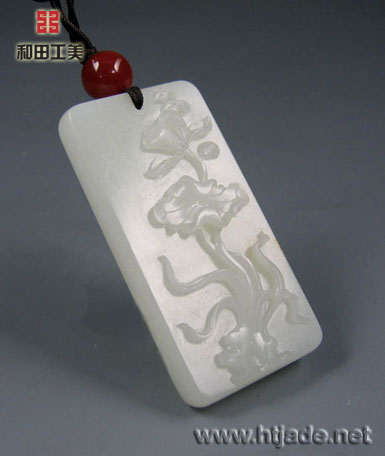 和田玉籽料方牌.材质温润细腻,白度好,玉牌呈圆钝角,高浮雕荷池一株莲,柔嫩旖旎,花儿绽放,叶子舒展,玉牌工艺细致,颇有动感,似与花香就近在咫尺。侧面皮色处隐约一条浅缝,无碍。
