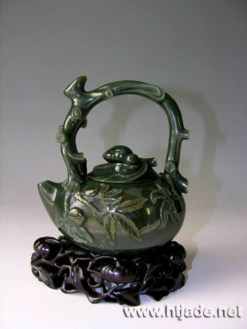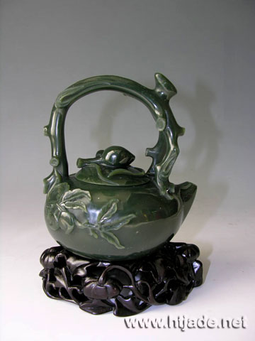 中国人自汉代已有饮茶习惯,长久以来,喝茶已发展为茶道,形成一种特殊的饮茶艺术,尤其对茶具更是颇有讲究。此件茶壶,以优质青玉琢成,质地缜密温润,纯净度非常好,壶身饱满,壶嘴朝上,造型朴实可爱,提梁琢成桃树的枝干,由壶尾往上攀延至壶嘴一分两枝,枝干连着壶身两侧,挂满了寿桃,一片枝繁叶茂,硕果累累,欣欣向荣的气象,令人愉悦,壶盖琢成两只并蒂寿桃置于叶子上,与整器融为一体,壶身内部掏膛平整,壶壁薄可见光,足见精湛功力,置之几上,斟用者的品位自不待言。