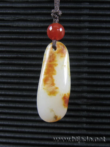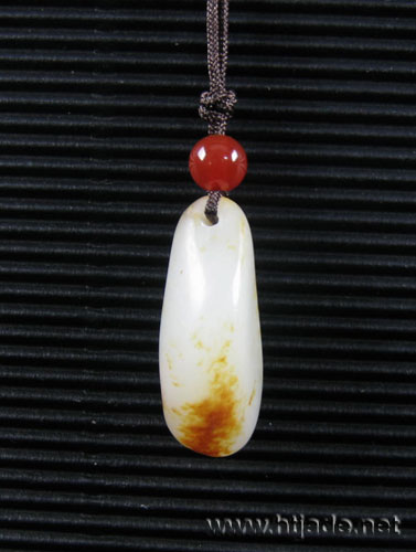 新疆和田玉籽料原石,白度达羊脂,玉性很好,红皮飘逸浓艳,形完整,无缝无裂,背面皮色处有微花,无碍,佩带非常亮眼。(图片比实物色泽上稍亮) 产品图一: 产品图二: