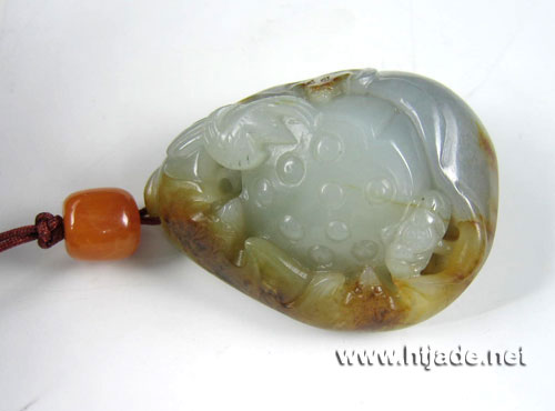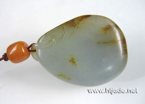 和田玉籽料白玉挂件喜讯连连。以新疆和田玉籽料为材。材质细腻温润,皮色好,背面肉质略泛青,题材为一只大荷叶包裹一莲蓬,皮色处巧雕三只蝙蝠,莲蓬处附着一个小的莲蓬,生动活泼,一只喜鹊振翅飞来,寓意飞来喜讯,喜讯连连。 产品图一: 产品图二: