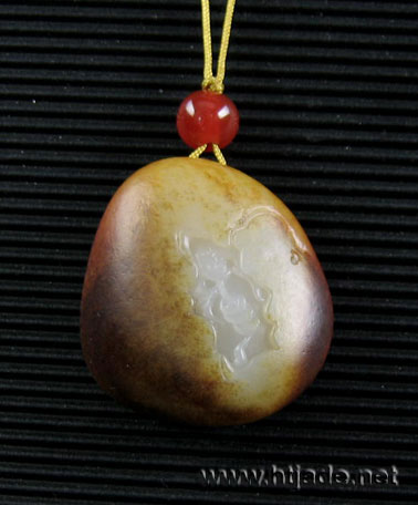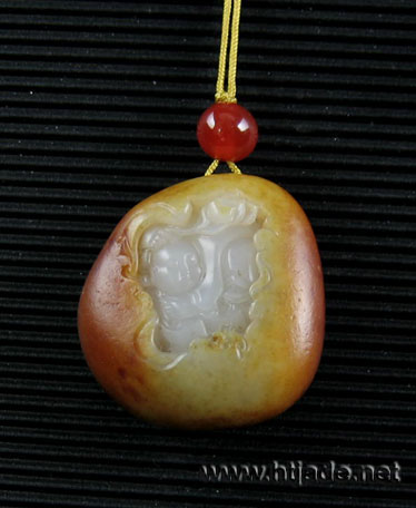 和田玉籽料挂件。玉质白净细腻,通体满皮,巧开窗正面琢一童子笑态盈盈,手持一荷叶,背面琢一蝙蝠口衔一串铜钱翩然而至。整体形完整,皮色和肉质都可算是上等,工艺精细,无论是收藏或是佩带都很不错,可寓意为“招财进宝”“福在眼前”。 产品图一: 产品图二:
