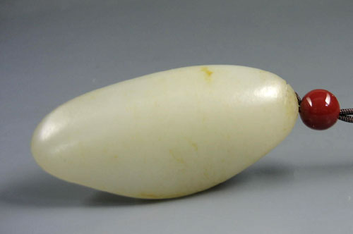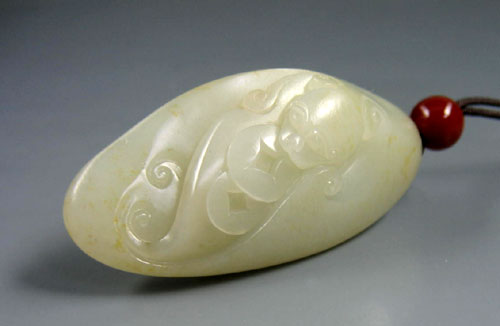 和田玉籽料白玉把件福在眼前。以新疆和田玉籽料为材,材质缜密细腻,脂感浓烈,白度中等,偏黄,属熟透的料子,工艺师最大限度的保留了料子的完整和外形,浮雕一只蝙蝠口含铜钱,蝙蝠五官俱细,舒展的双翼于料形巧妙融合,设计颇见匠心,工艺线条流畅,繁简从容,蝠谐音“福”,钱谐音“前”,“福在眼前”的寓意已心领神会,玉件老气,耐看,随手,握于手中,籽料原石自然淳朴温厚的品性,更是令人心动。