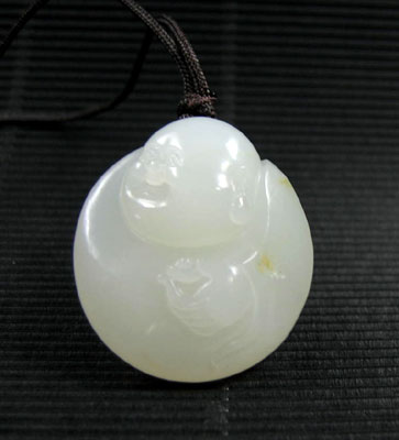 和田玉籽料白玉挂件笑佛。以新疆和田玉籽料为材。材质等级高,质地缜密细腻,清澈朗润,白度佳,玉件高浮雕笑佛圆圆的前额,圆圆的笑脸,手托元宝,模样憨态可掬、亲切可人,暗示阔口常开,笑纳天下财,再配以圆圆的外形轮廓,顿生圆圆满满之感。玉件料工上乘,是值得收藏的小珍品。