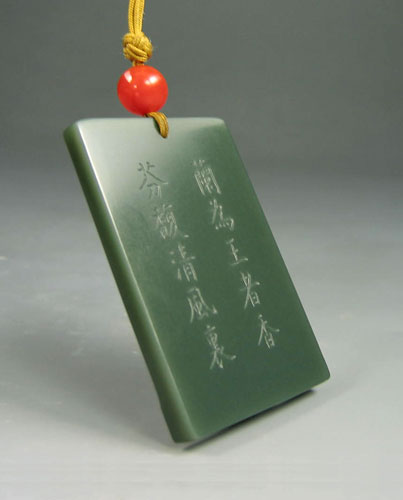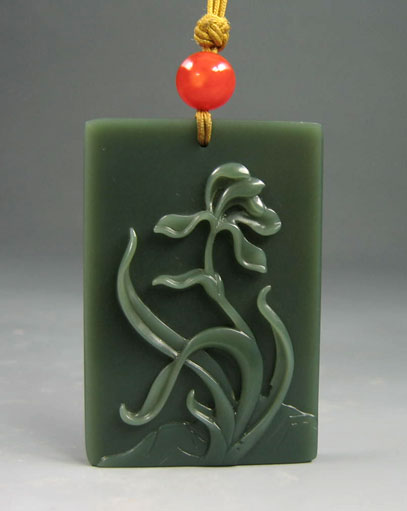 和田玉青玉方牌。材质致密坚实,纯净润朗,色呈湖绿,工艺师采用高浮雕技法,绘画式构图:一簇幽兰,花叶纷披,纠缠交错,是空谷中的风儿,才会令幽兰有如此风姿吧?柔美中带着刚性,清逸中透出不羁,正可谓是“花中真君子,风姿寄高雅”了。玉牌,养眼。