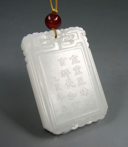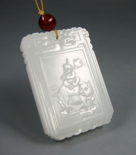 玉牌以上等新疆和田玉山料琢之,材质细腻温润,纯净无杂,白度佳,以传统图案构图,胖胖的金童,赤身着肚兜,双手执如意,嫩肩扛之,坐在猪背上,开心而笑,身下的福猪,殷实福态,喜气洋洋,背面刻字“金童呈瑞气,吉祥长如意”点明玉牌主旨。玉牌4*6的规格子冈牌,风格古朴厚重,加之上好的白度,舒适的手感,令人心仪。