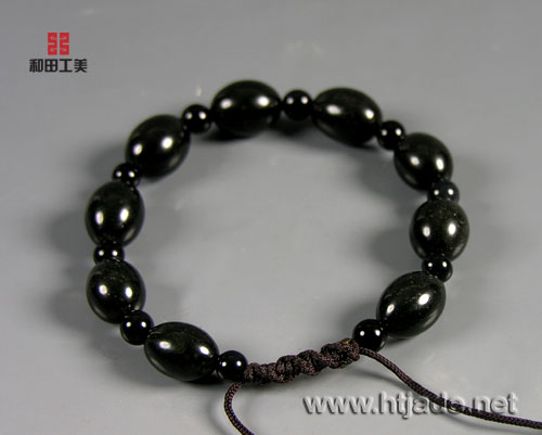 和田玉墨玉籽料手链。以新疆和田玉墨玉籽料为材,形如橄榄,色泽如貂毛般漆黑油亮,含金砂点点,色纯净。抛光柔和细腻,佩带给人神秘之感。