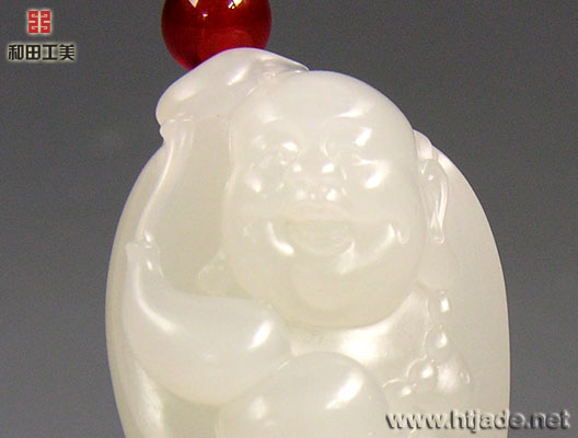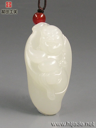 和田玉籽料白玉挂件笑佛,以新疆和田玉籽料为材。玉质缜密细腻,油润光洁,脂感浑厚,白度佳。随形琢笑佛,满面笑容,手持一宝葫芦,似驾祥云而来,品相佳。玉件背面光素,触之如婴儿肌肤般温润,适合佩带。