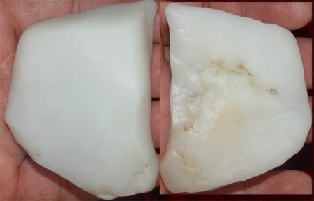 一是石英岩类玉石,色白、质地较细,外观很像白玉,过去所谓的"京白玉",就是一种细粒石英岩,地矿部门评价的“油石”矿,颗粒很细,但不能称为白玉,石英岩类的玉石硬度比和田白玉高,因此比白玉显出更强的玻璃光泽,在没有仪器检测的情况下,可以据此分辩。