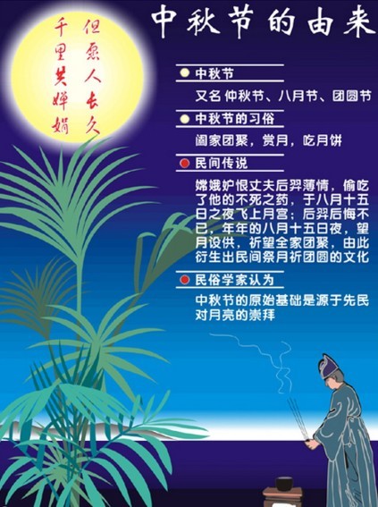 我国古代很早就有祭祀月亮的礼俗,据《周礼》记载,周代已有“中秋夜迎寒”、“秋分夕月(拜月)”的活动;农历八月中旬,又是秋粮收获之际,人们为了答谢神祗的护佑而举行一系列仪式和庆祝活动,称为“秋报”。中秋时节,气温已凉未寒,天高气爽,月朗中天,正是观赏月亮的最佳时令。因此,后来祭月的成分便逐渐为赏月所替代,祭祀的色彩逐渐褪去,而这一节庆活动却延续下来,并被赋予了新的含义。