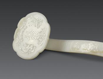 如意的形状像长柄钩,钩头扁如贝叶。摸起来手感光滑,很像在摸绸缎。看起来晶莹剔透,有光泽。明、清两代,取如意之名,表示吉祥如意,幸福来临,是供玩赏的吉利器物。