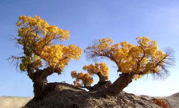 胡杨是荒漠带上惟一的大乔木。在荒漠上只要看到高20米以上的大树,不用问,它准是胡杨树。